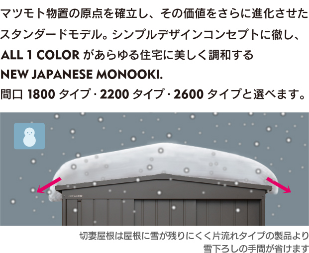 - 切妻屋根は屋根に雪が残りにくく片流れタイプの製品より雪下ろしの手間が省けます。