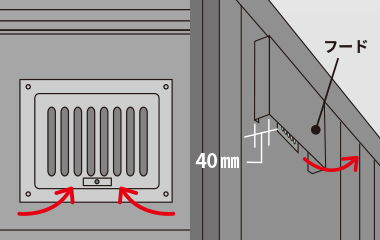 フード付(標準装備)。 左右の壁面に取り付け可能で開口部分