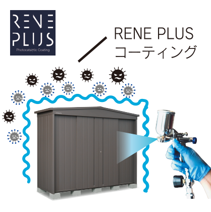 光触媒コーティング - 光の力で24時間365日除菌・抗ウィルス・防虫・消臭。RENE PLUSは、銀イオン+銅イオン+ナフィオンを化合した最新ハイブリッド型の光触媒コーティングです。太陽光はもちろん、蛍光灯などの可視光でも強く反応します。触れないような場所は半永久的に効果があり、SBBのゴミボックスもコーティングすることでゴミの臭いや、ゴミに集まる虫などを防ぐ事が可能に。しかも防サビ効果も期待できます。マツモト物置はすべてのお客様へオススメしています。